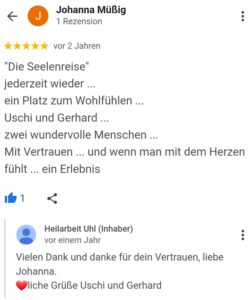 Ich biete anderen mein Heilwissen in Heilbehandlungen an und habe das Gefühl, gut für diese Arbeit vorbereitet zu sein. Wenn ich diese Arbeit anbiete, fühle ich mich vollkommen in Liebe und die Resonanz meiner Klienten sind positiv. Sie möchten alle wiederkommen und ja, ich kann diese Ausbildung weiterempfehlen. Ich glaube diese Ausbildung ist für Menschen geeignet, die ins Licht kommen möchten, ihre Ängste selbst sehen und auflösen möchten. An der Ausbildung am besten gefallen hat mir die Herzlichkeit und die ehrlichen und treffende Worte, auch wenn man so manches selbst erst einmal nicht hören möchte. Ich bin mit der Arbeit von Gerhard und Uschi zufrieden, weil ich auch ohne Erwartungen gekommen bin und am Ende mit viel Wissen und Heilung gegangen bin. Ich komme wieder, aber sicher.