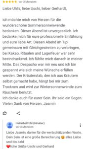 Ja, ich kann diese Ausbildung weiterempfehlen und ich glaube, dass diese Ausbildung für Menschen geeignet ist, welche ein sensibles Gespür, spirituellen Weitblick und Offenheit für sich erreichen möchten. An der Ausbildung am besten gefallen hat mir das letzte Wochenende. Die Übernachtung im Tipi und das alleine sein im dunklen Wald, um das Erwachen zu beobachten. Ich bin sehr zufrieden mit der Arbeit von Uschi und Gerhard.